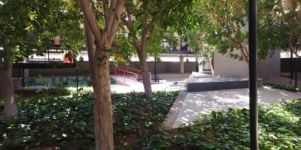 Experience a sense of peace in the courtyard that features a serene water fountain surrounded by mature trees creating a relaxing environment.